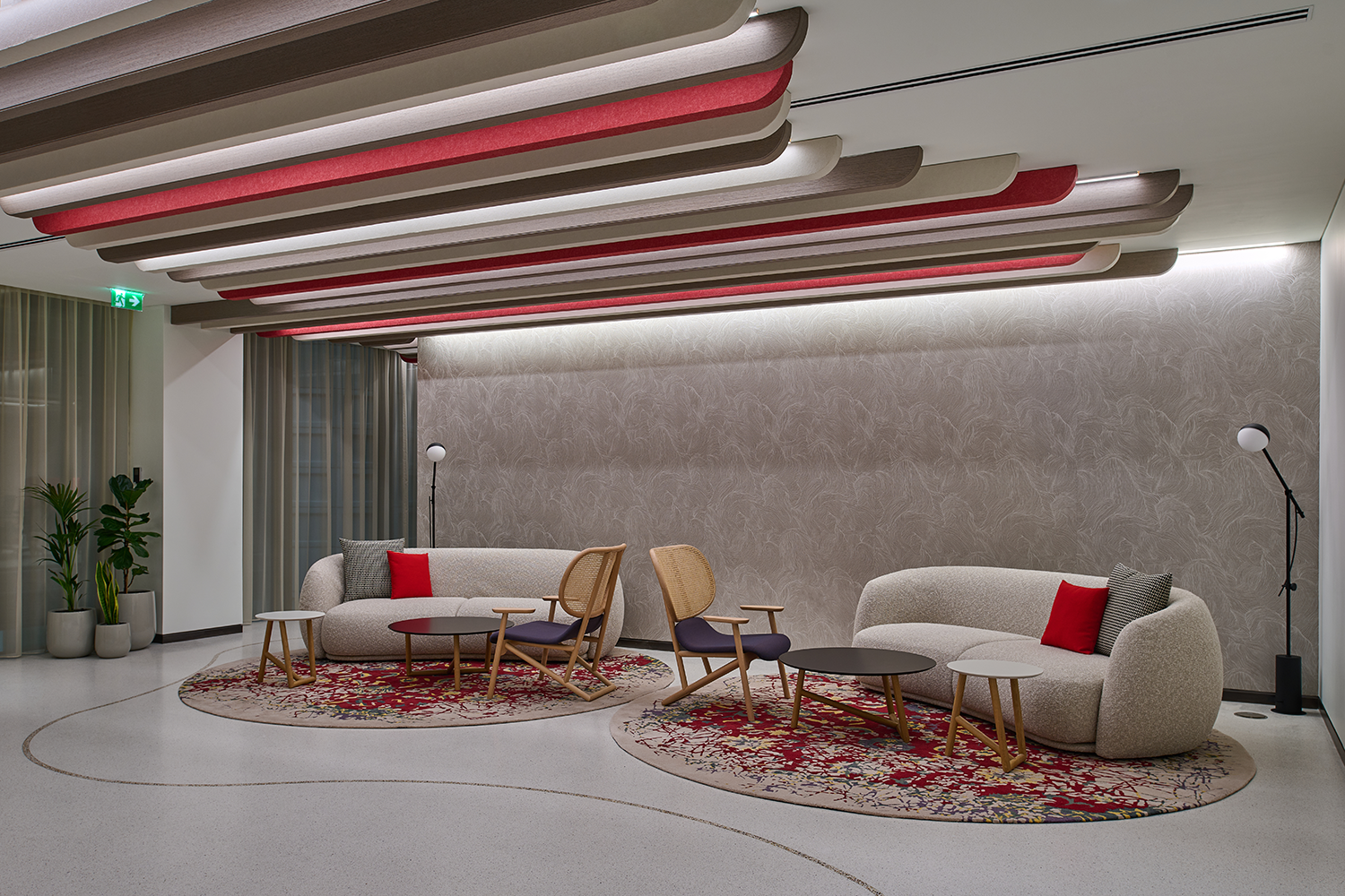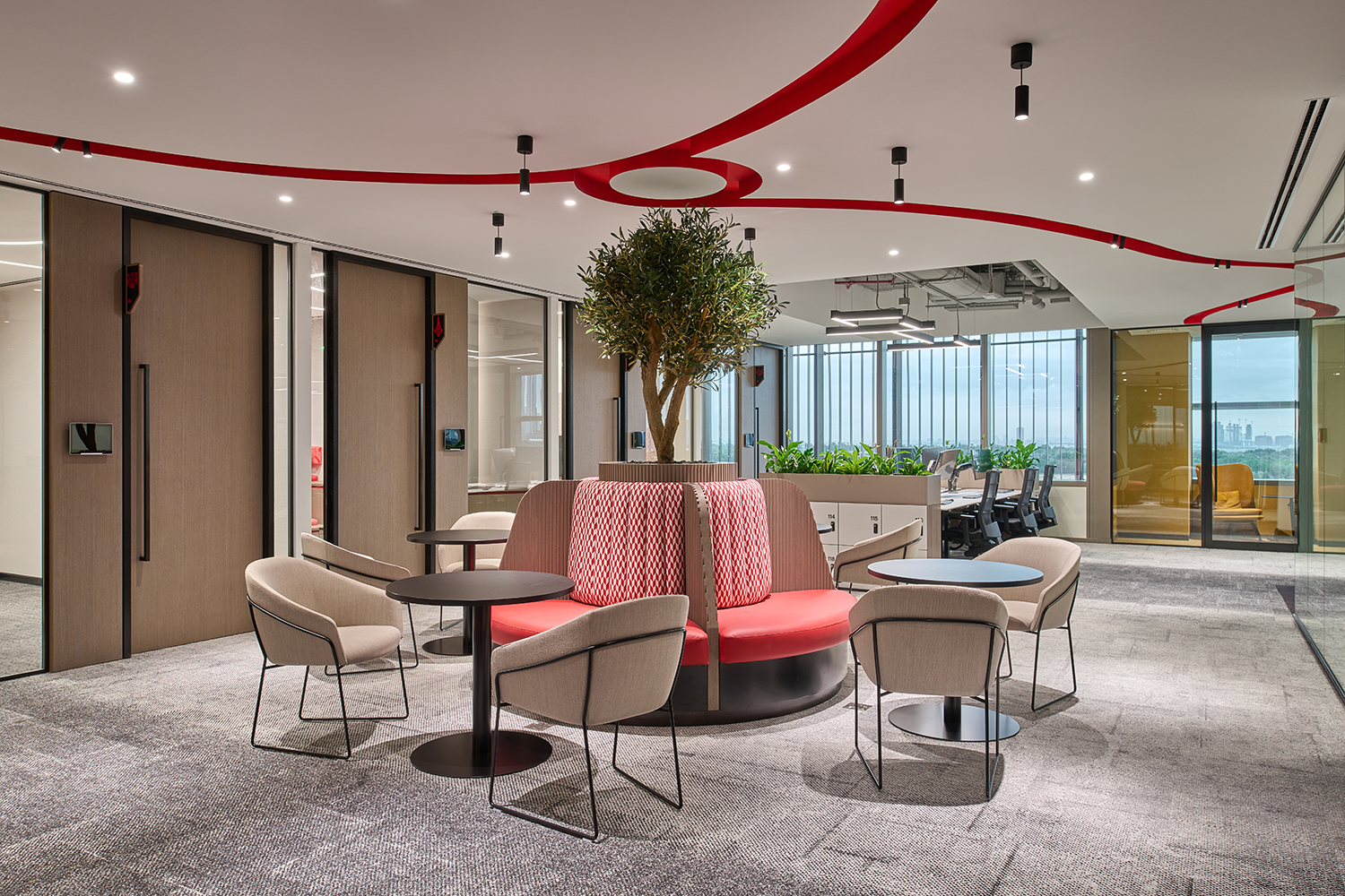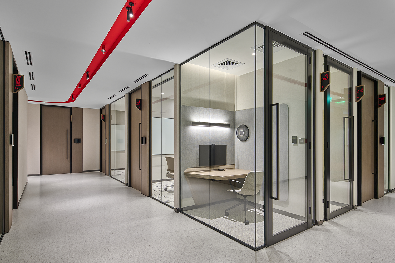 To enhance functionality, soundproof booths were brought to life with overhead illumination and gentle wall washing behind inviting banquette seating, once again employing solutions from the Eco Flex family. Adding a layer of visual dynamism, surface-mounted grid-framed ceiling details adorned the conference room areas in square patterns. Common areas received a playful touch with free-flowing linear lines accentuated by striking red sides, weaving across the ceiling. This motif extended to the curved lit feature above the desk, featuring black up stands for a unique twist on the design language.