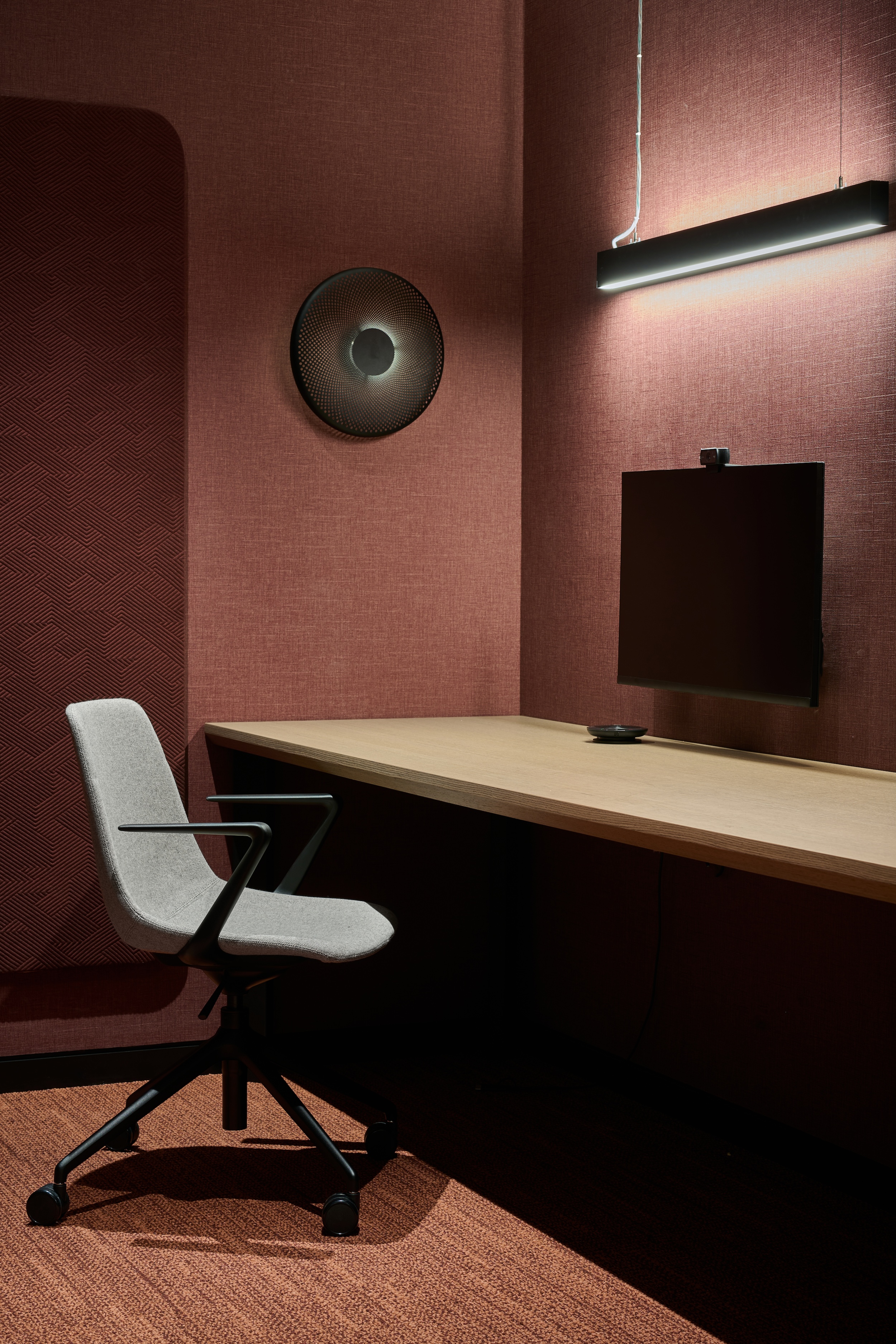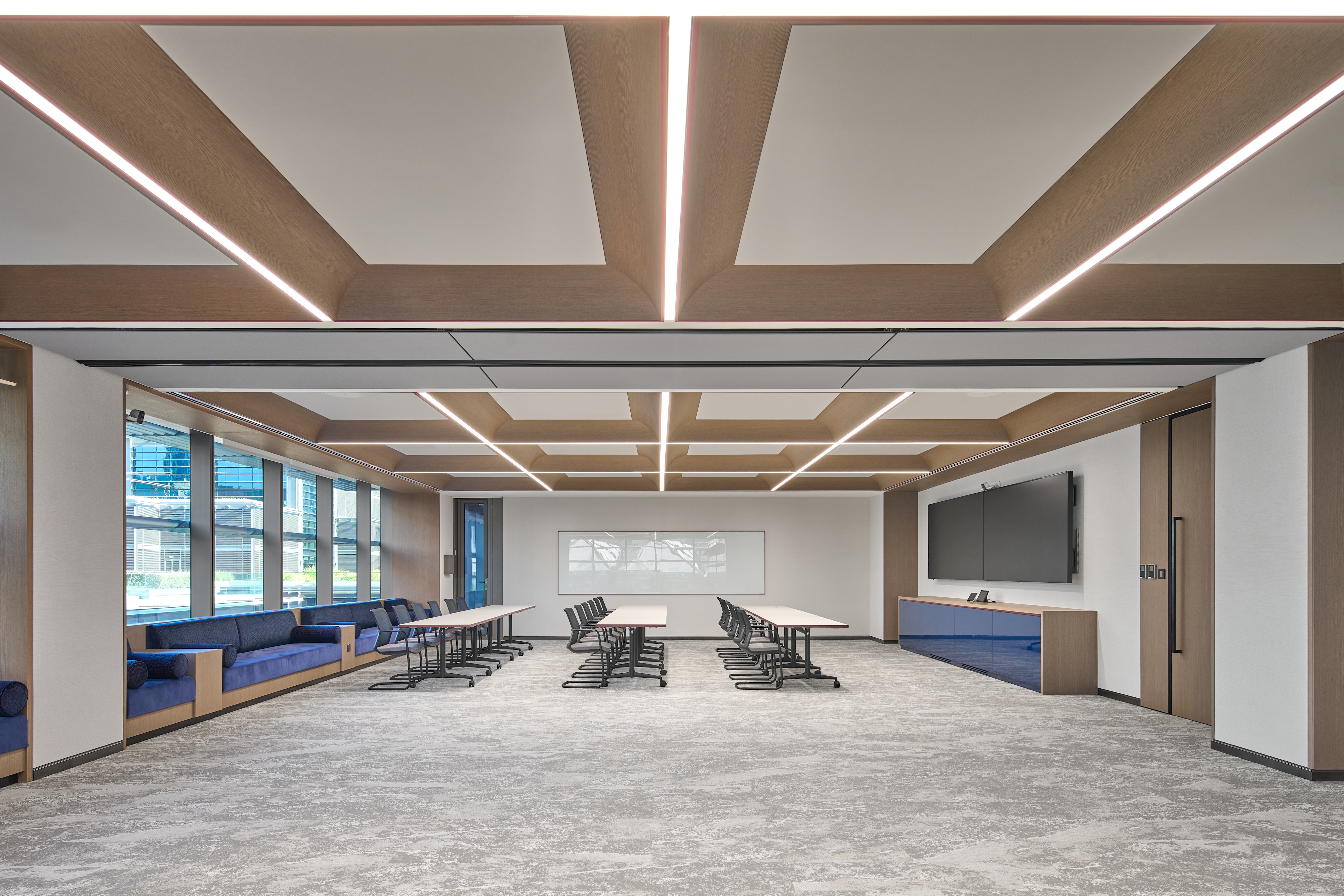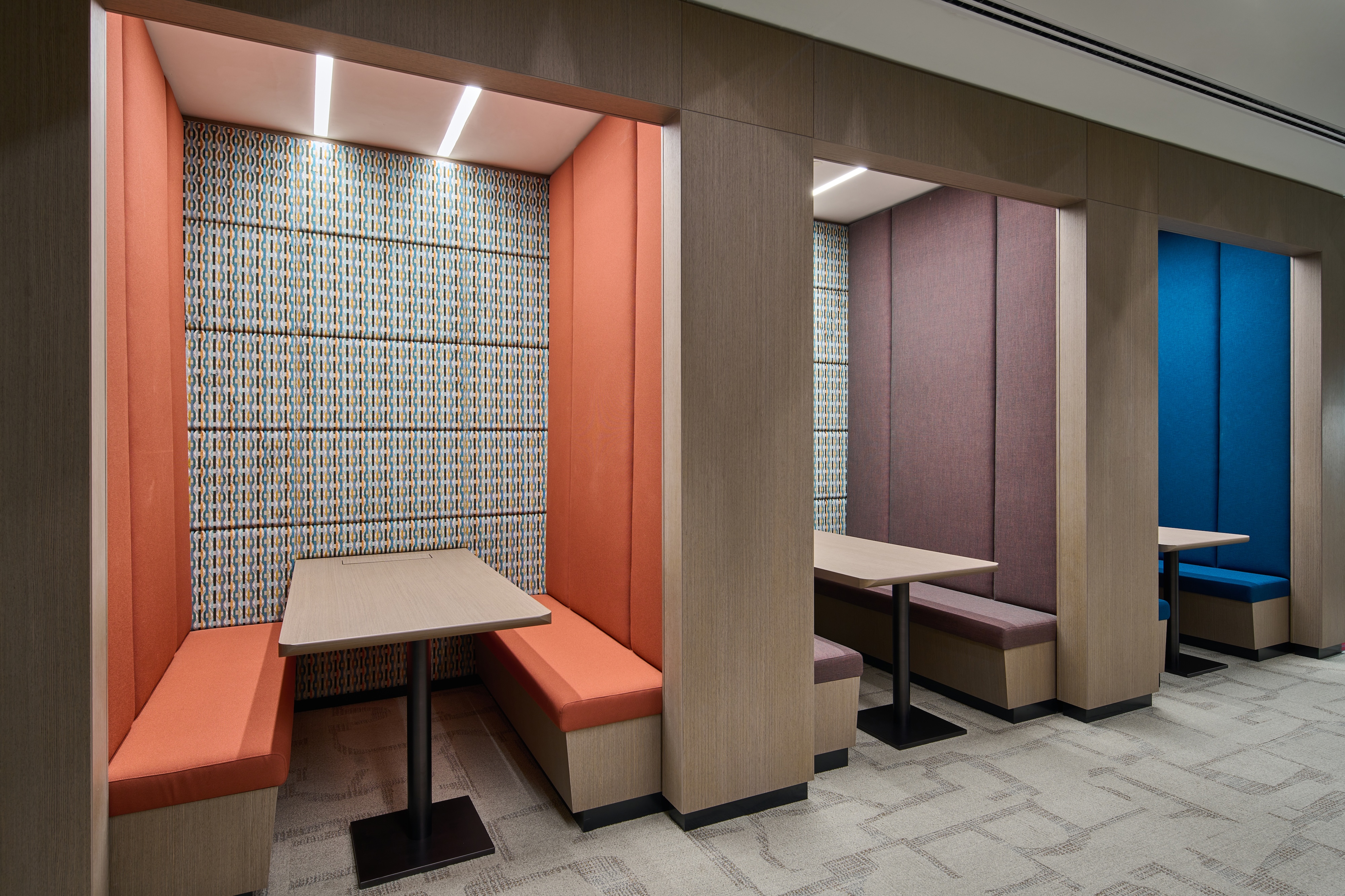 To enhance functionality, soundproof booths were brought to life with overhead illumination and gentle wall washing behind inviting banquette seating, once again employing solutions from the Eco Flex family. Adding a layer of visual dynamism, surface-mounted grid-framed ceiling details adorned the conference room areas in square patterns. Common areas received a playful touch with free-flowing linear lines accentuated by striking red sides, weaving across the ceiling. This motif extended to the curved lit feature above the desk, featuring black up stands for a unique twist on the design language.
