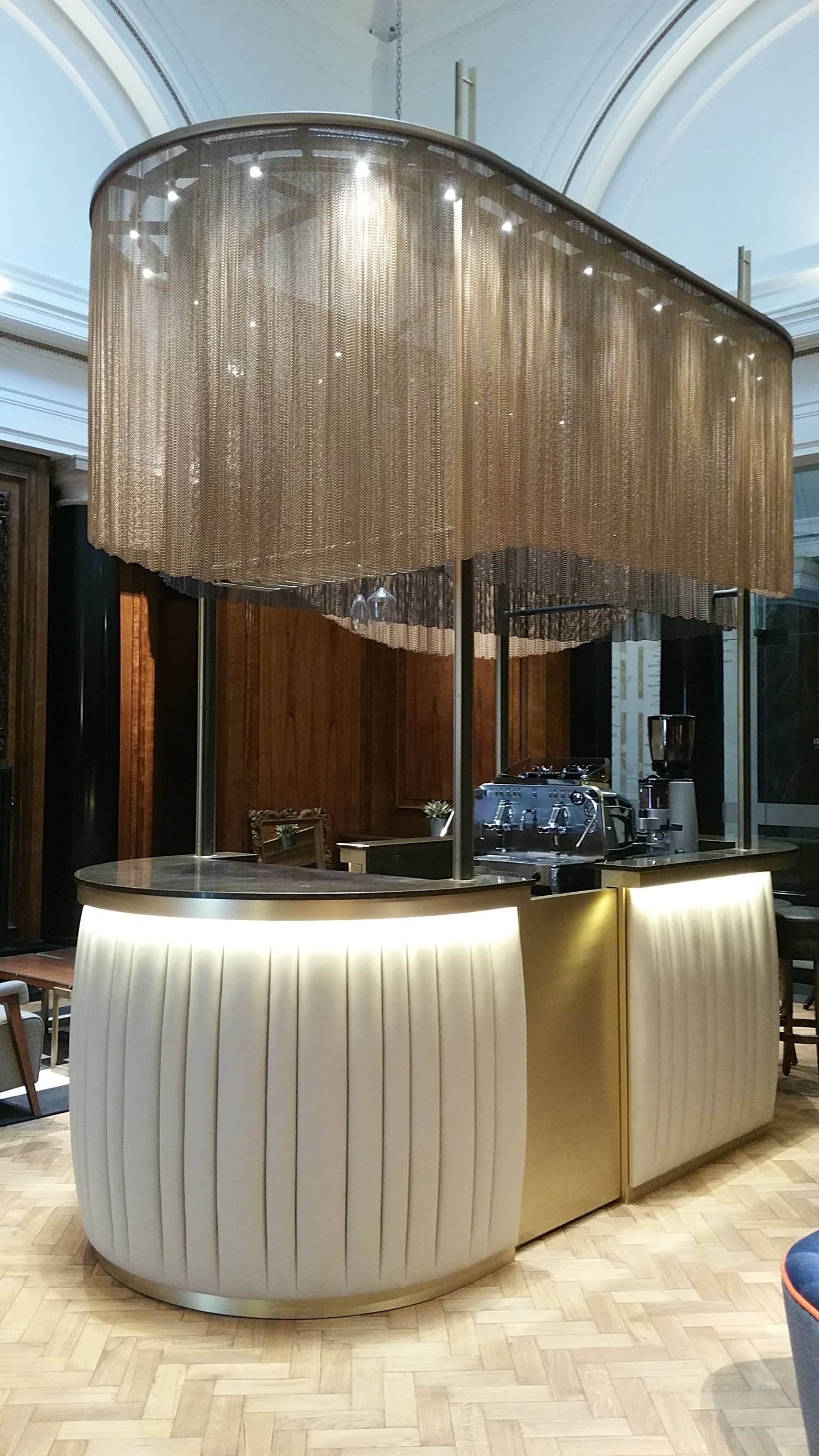 The lobby provides the ideal space to meet up with friends or colleagues in the heart of London and guests can relax with a selection of pastries and beverages. Our Maxi Neon from the Neon range was inserted into the underskirts of the countertop, matching the glistening gold mesh dangling above, in order to highlight the champagne bar as the centerpiece of the lobby. Guests can begin their memorable stay at the hotel with a stress-free check-in at the hotel reception and after that, from the comfort of the most spacious guest rooms in the city, they can admire an impressive panoramic view of London under the ambience of our Maxi Neon.