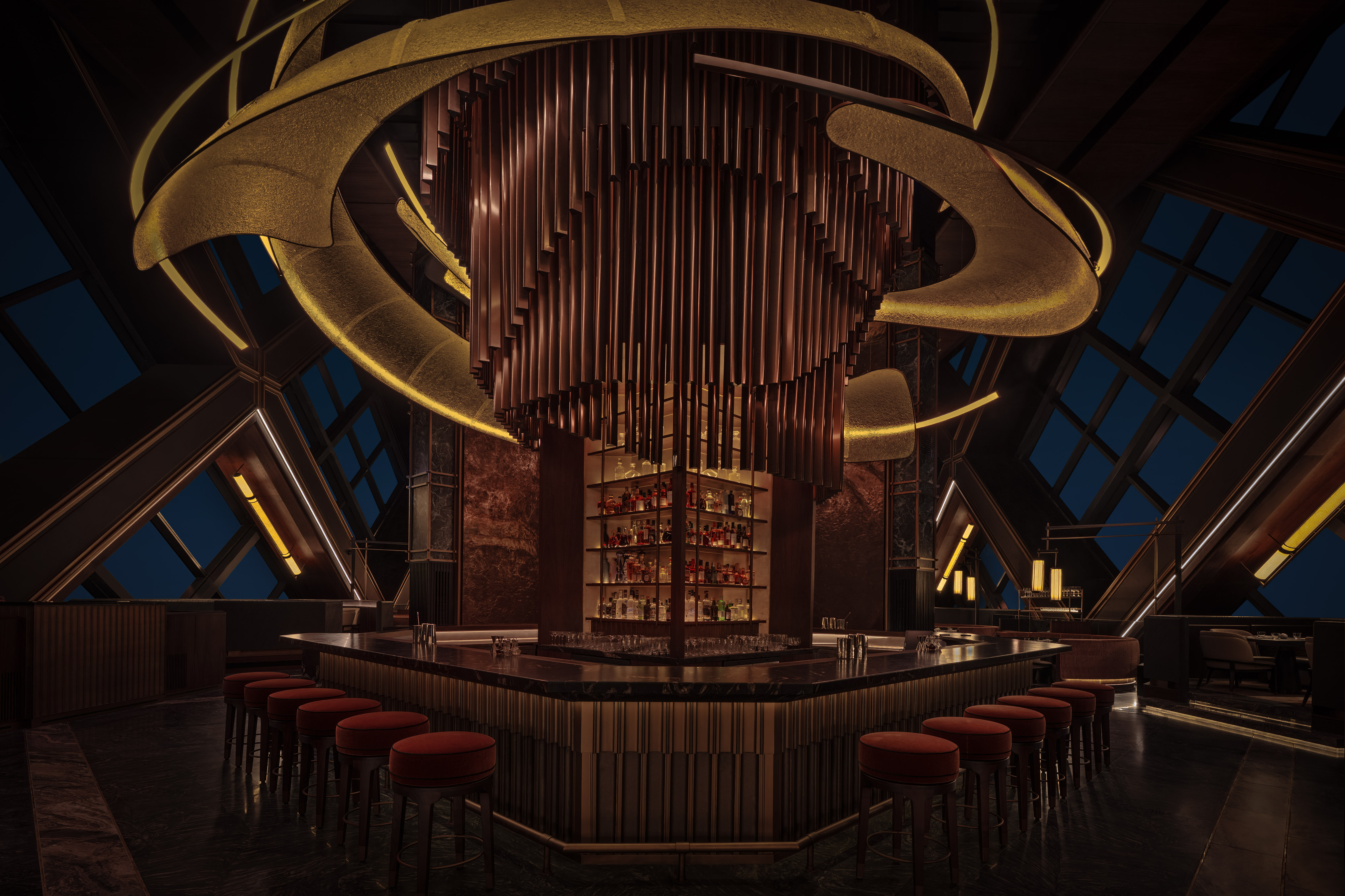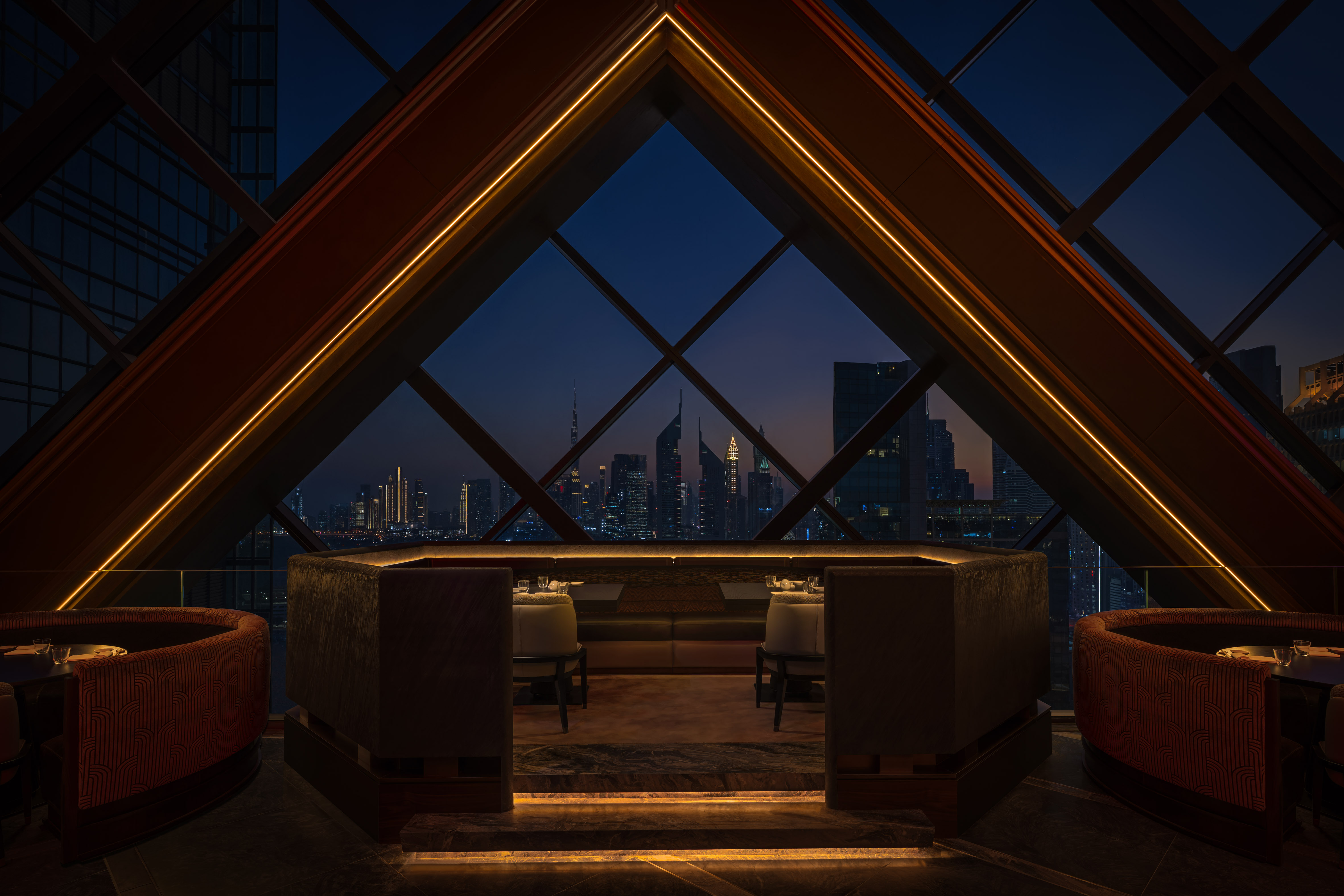 At the perimeter, triangular glazed façades are articulated using Ultimo Neon, our silicone-encapsulated, dot-free solution engineered for seamless continuity. Uniform vertical illumination frames panoramic skyline views while maintaining strict visual comfort against the night backdrop.