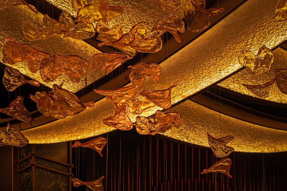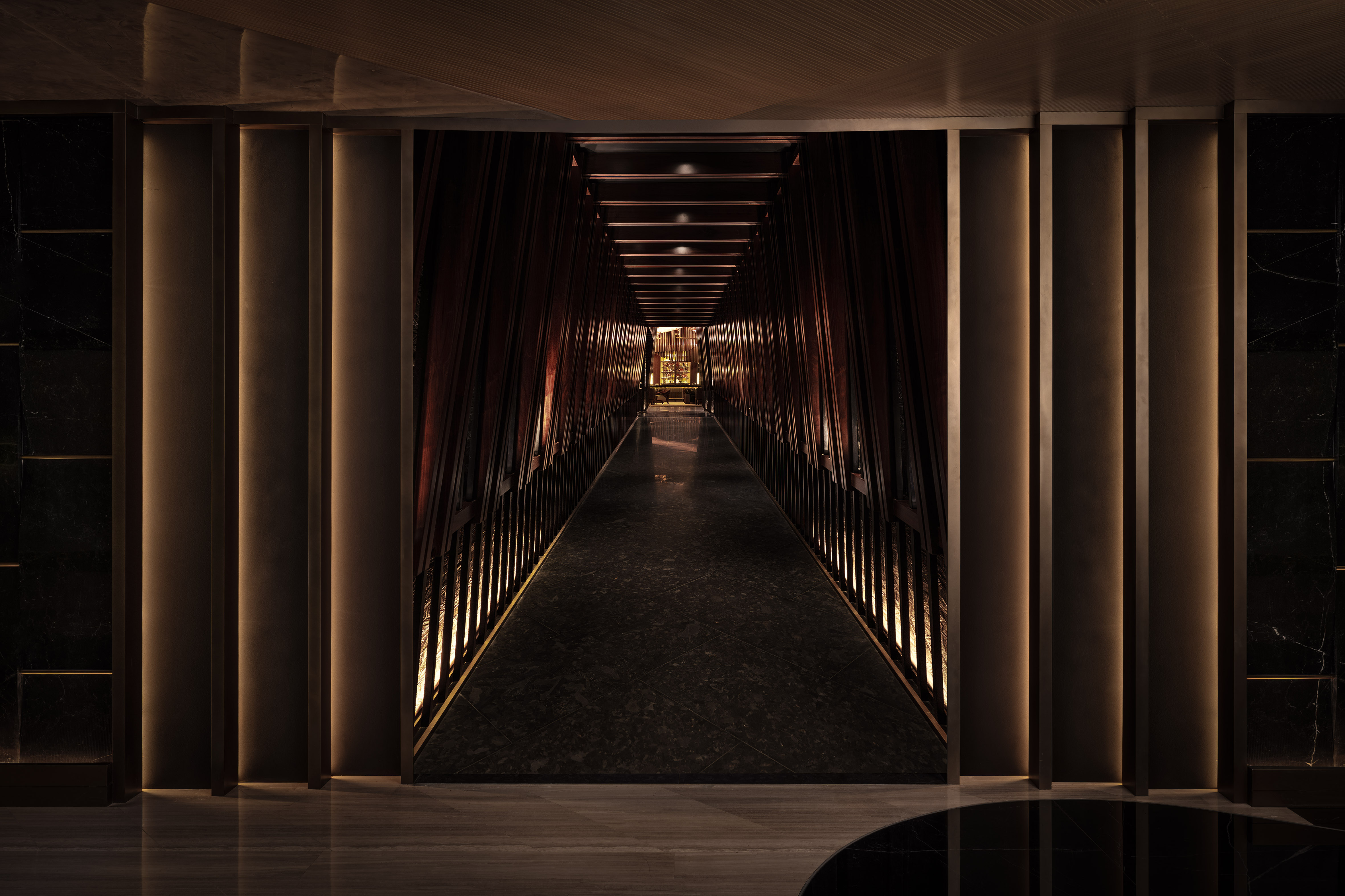 Arrival is deliberately compressed. Vertical architectural fins articulate the entry corridors, referencing the precision of Japanese joinery. Integrated Eco Flex LED light engines deliver a calibrated 2700K layer, managing visual adaptation from the exterior luminance of the city to Nobu’s darker, composed interior. Illuminance levels remain intentionally restrained, increasing contrast ratios and slowing the guest’s pace ahead of the spatial reveal.