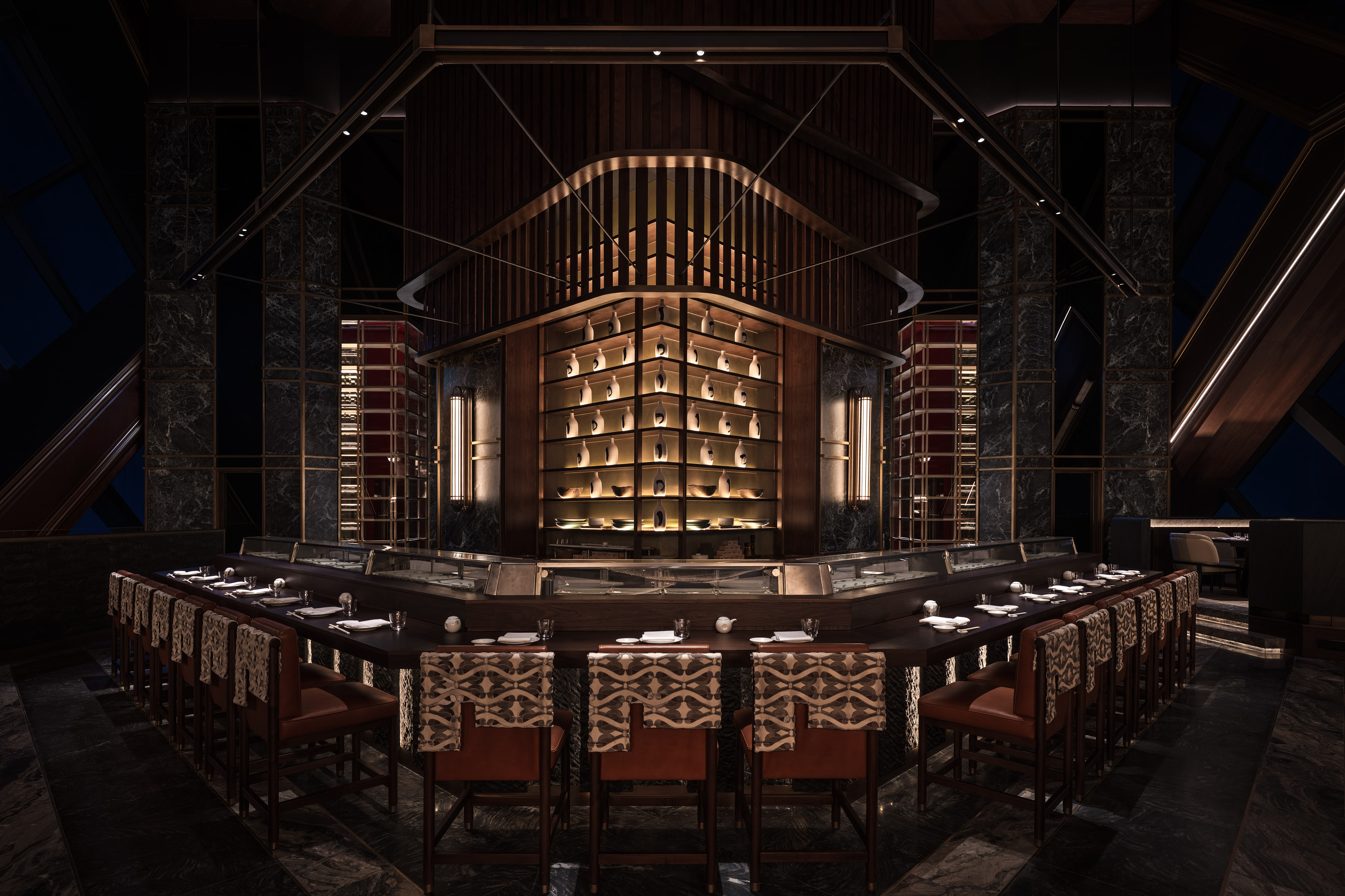 Across Nobu One Za’abeel, atmosphere is achieved through technical precision. Every linear element is seamlessly integrated, reinforcing material richness, spatial legibility and guest comfort. The scheme demonstrates that restraint, when engineered rigorously, becomes its own form of drama.