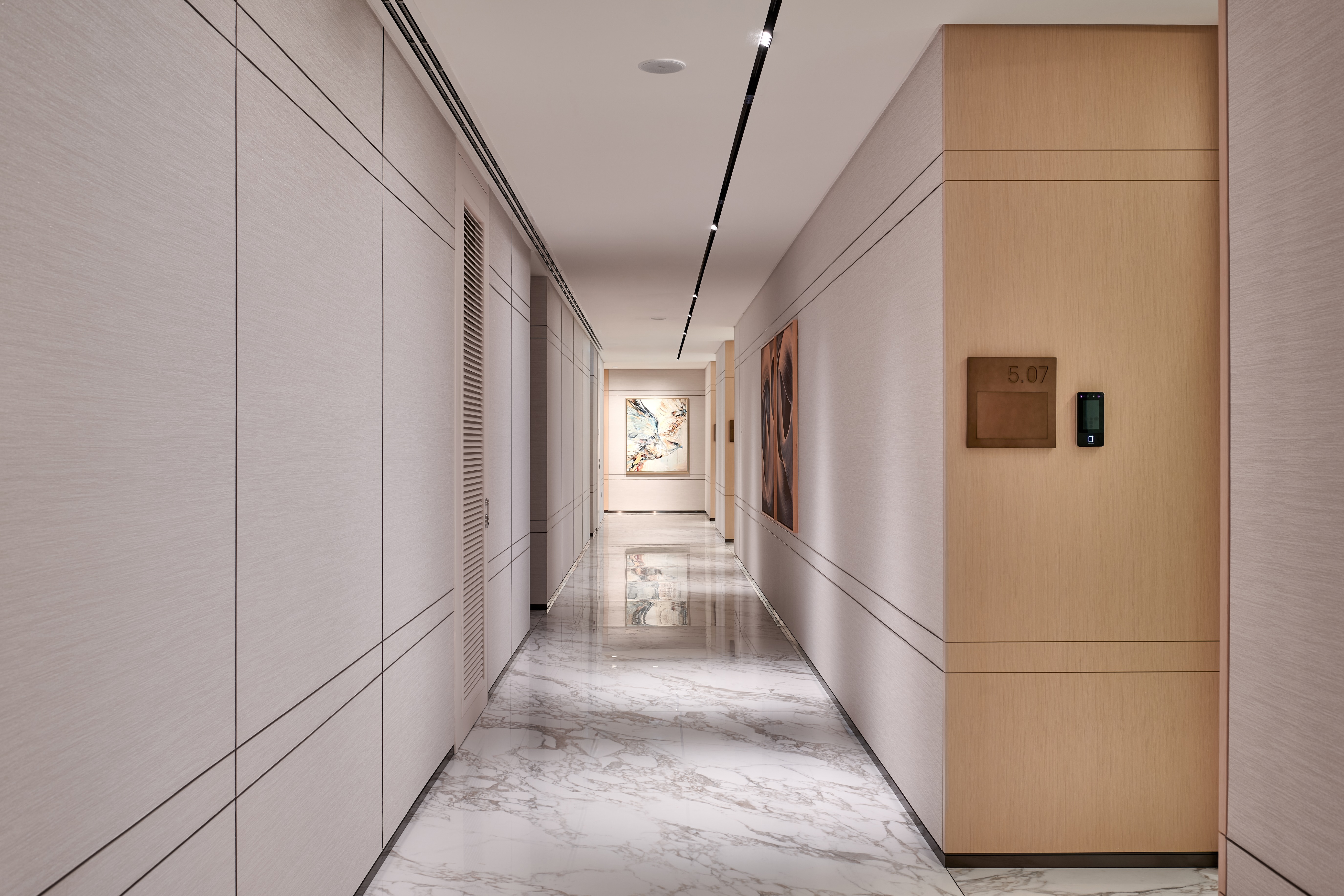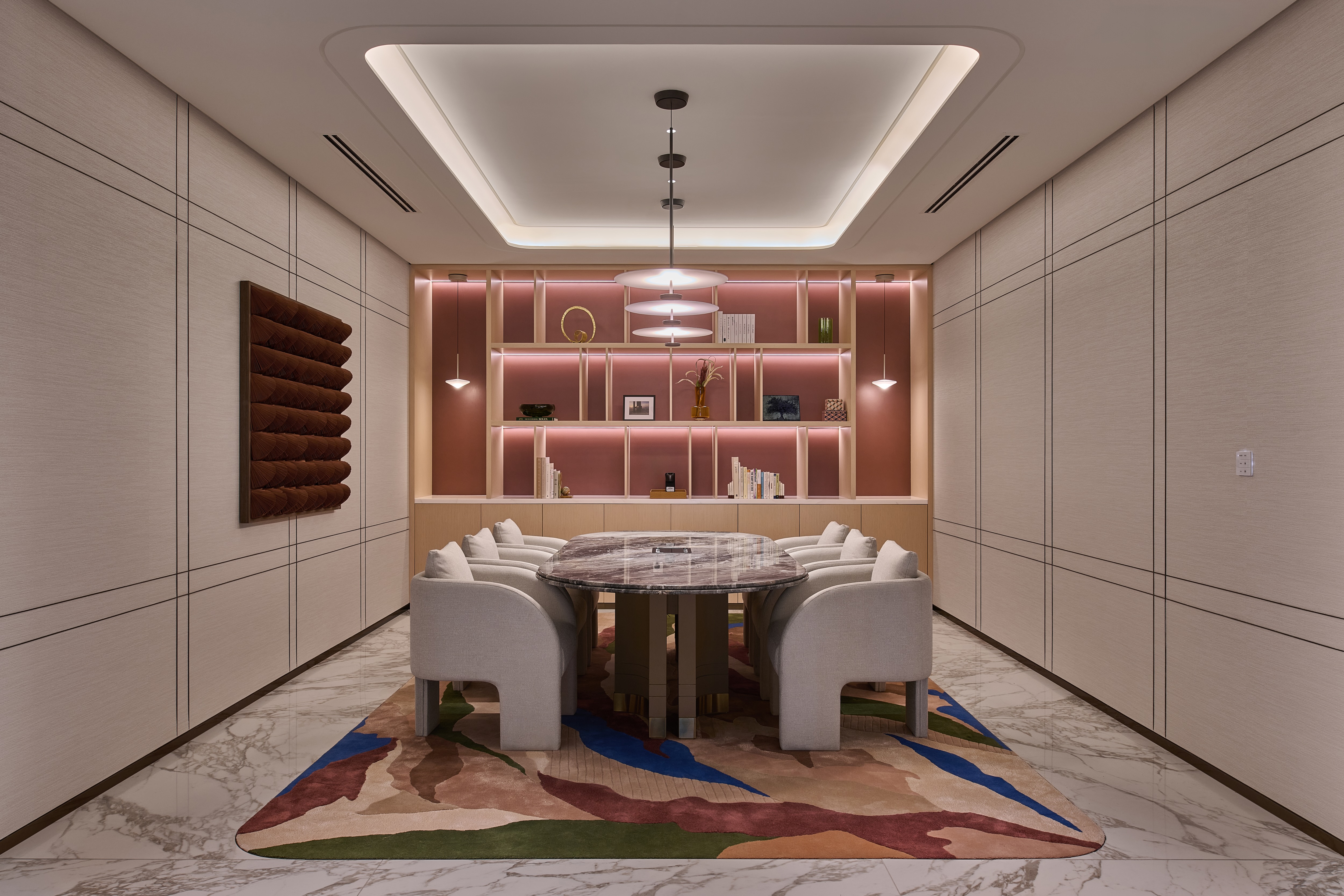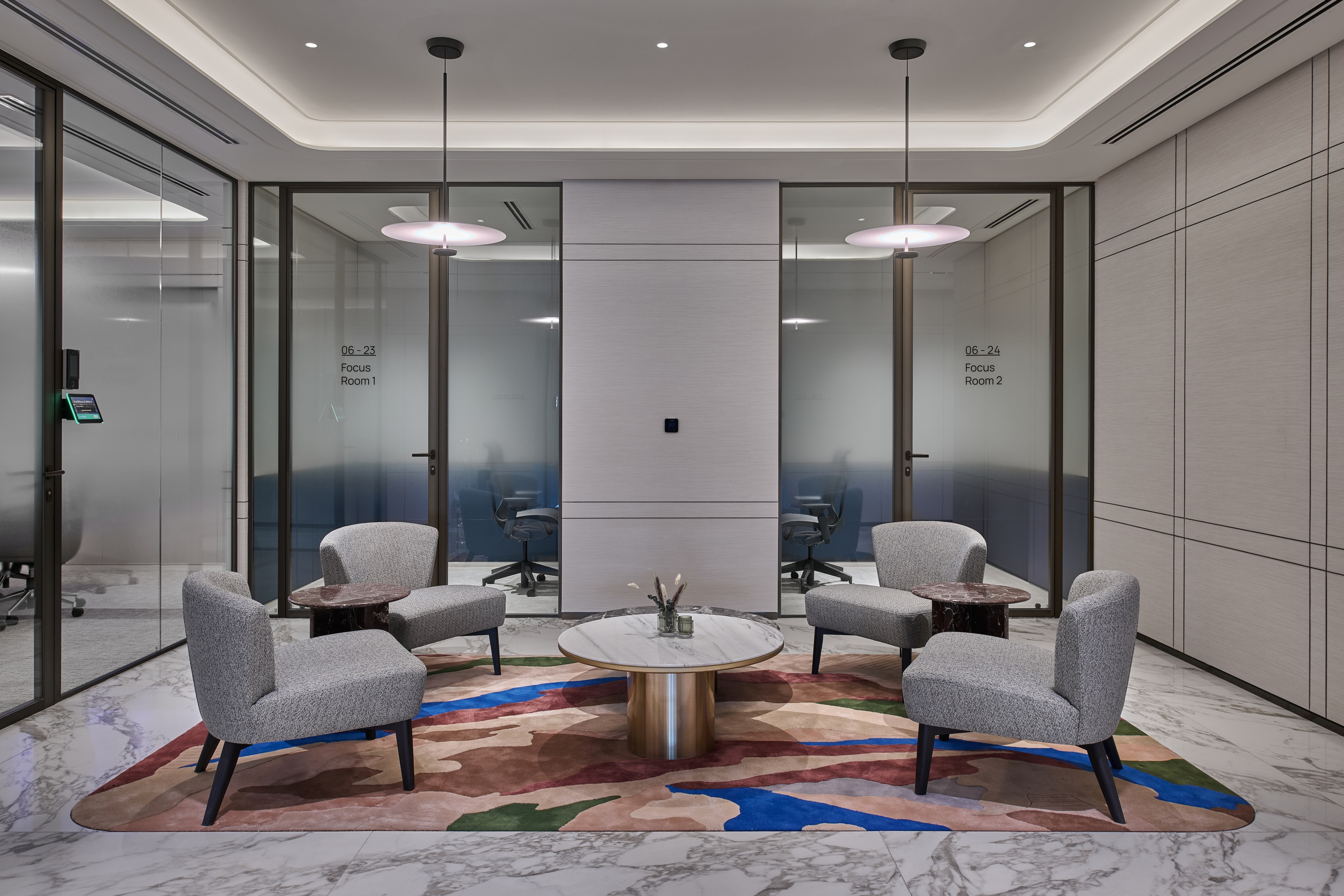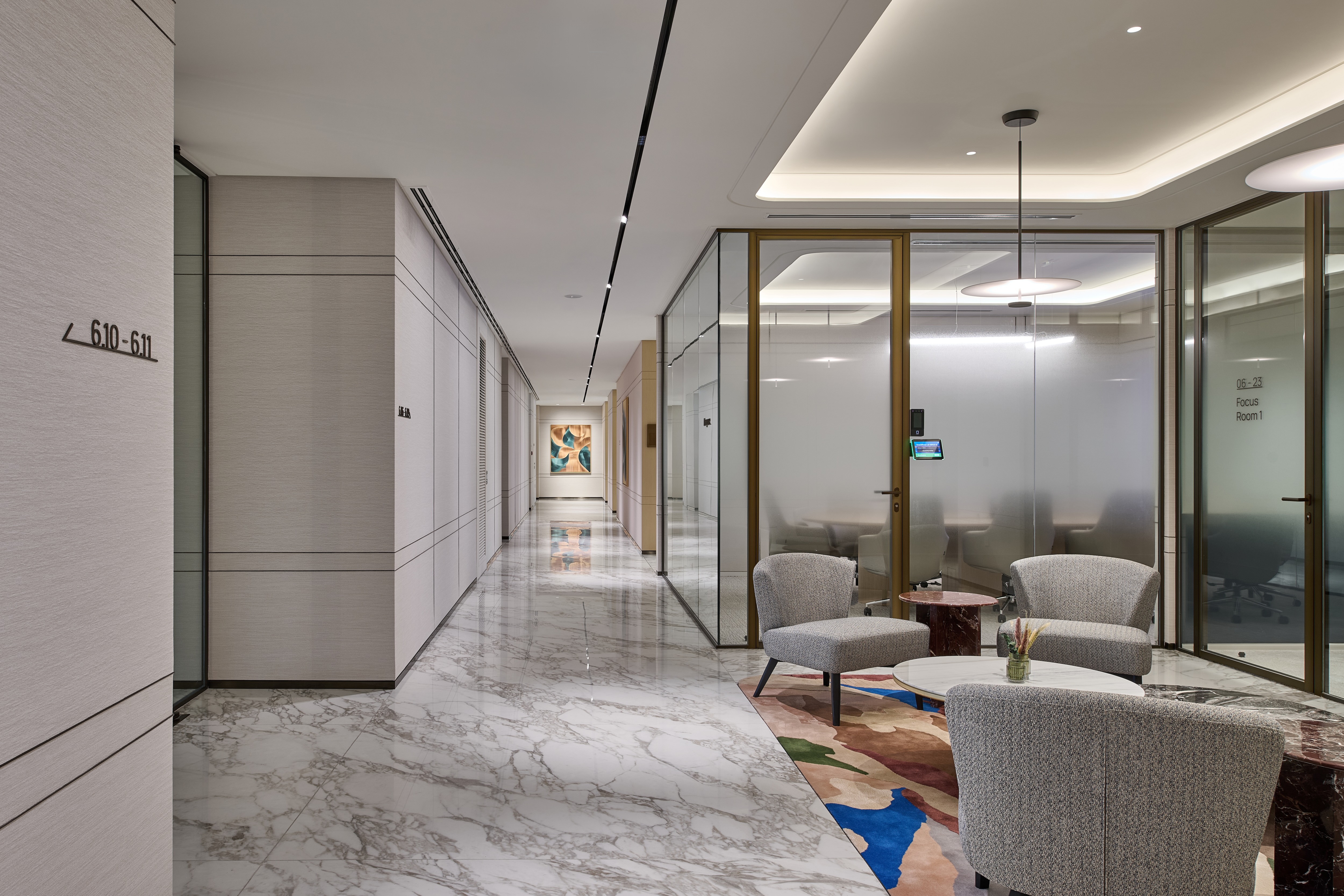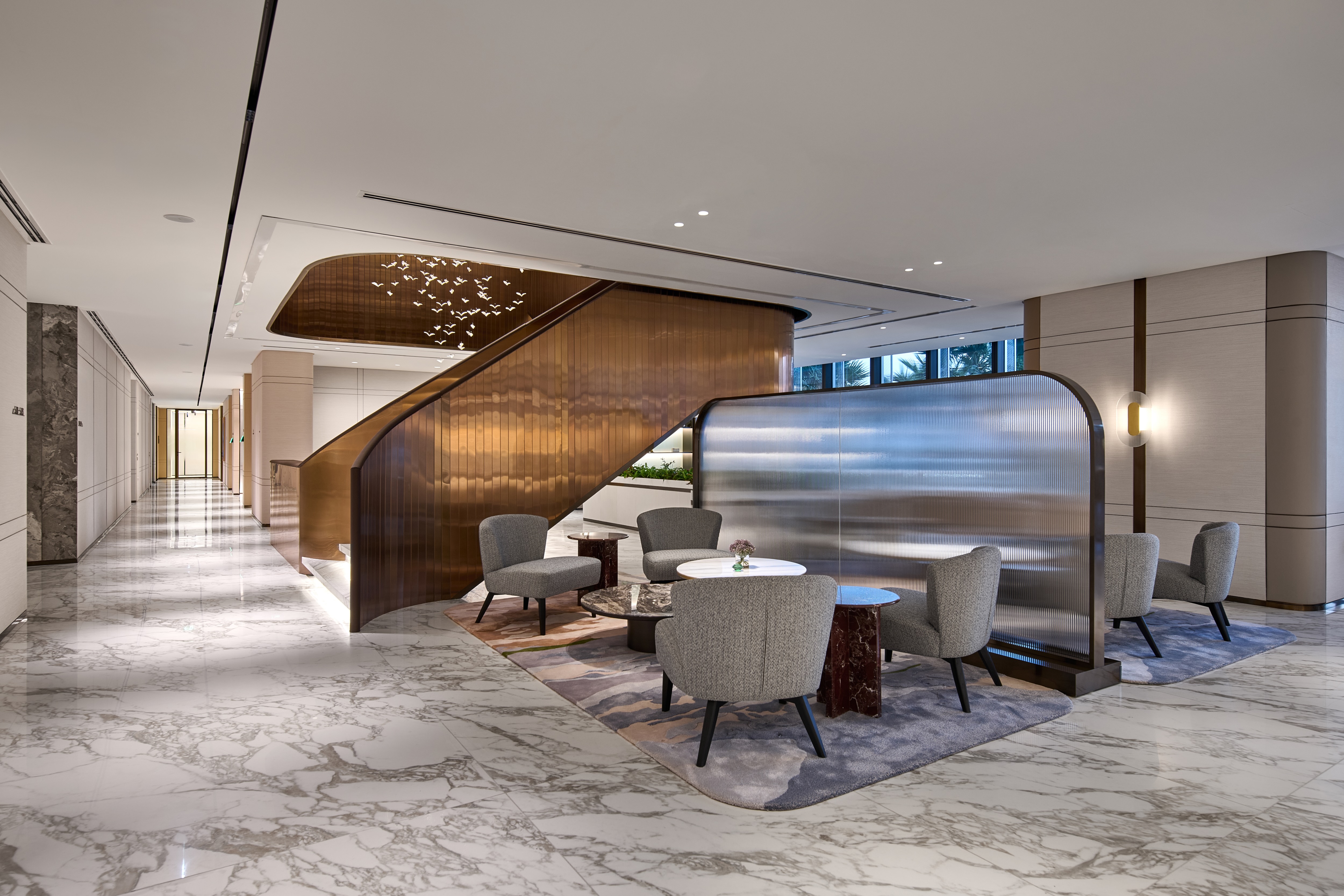 The reception area introduces the project’s design language through a striking marble-clad staircase, an architectural centrepiece accentuated by LEDFlex’s Lumen Line, a high-CRI LED light engine. Recessed into the underside of each tread, the lighting emits a diffuse, warm tone that enriches the texture and veining of the marble, while offering gentle wayfinding and visual rhythm across the vertical plane.
